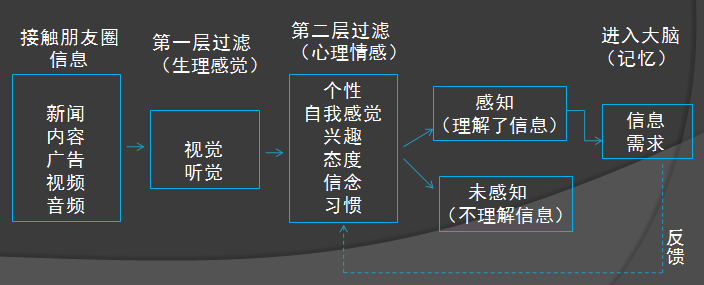 这样看来,决定着朋友圈里谁是“长久沟通的朋友”“谁是无信息互动和交流的朋友”的很重要的一个因素就是,你对朋友圈分享信息的过滤和感知,以及你筛选后留下的信息和自己的匹配程度。然而,这个过程可能是我们意识不到的,但却对我们最终的行为产生影响。那么我们是如何过滤朋友圈信息?