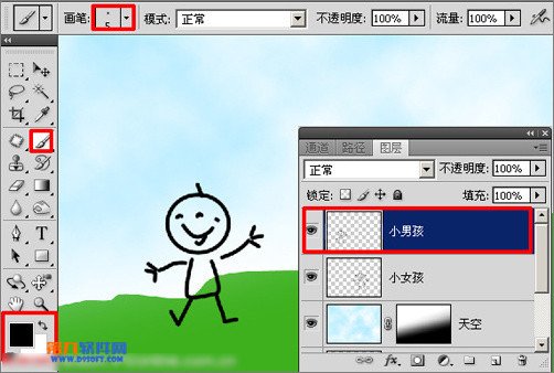 5、执行菜单:“图层”/“新建”/“新建图层”(快捷键Ctrl+Shift+N),新建图层并命名为“小女孩”,按D键恢复默认颜色,使用画笔工具,在工具选项栏上设置画笔大小为:尖角5像素,描绘出小女孩,如图6所示;新建图层命名为“小男孩”,一样方法,描绘出小男孩。