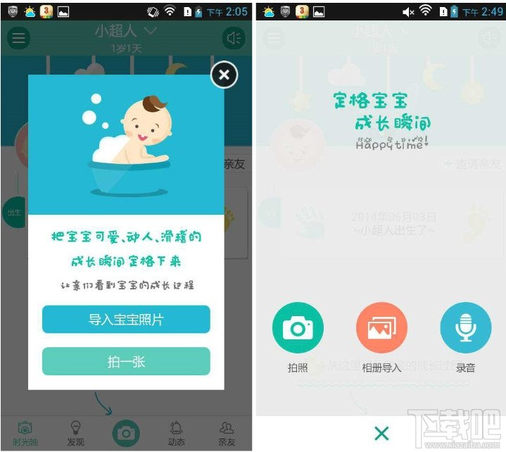 在宝宝主页,您可以利用文字、语音、相片等形式记录宝宝的成长过程。只要导入相册,亲子拍拍就可以自动识别照片的拍摄时间,自动整理出一条宝宝的成长时光轴,通过时光轴,你可以清晰的查看宝宝每一天的变化。
