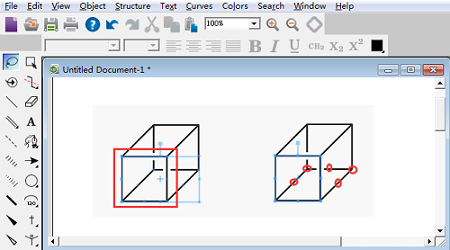 之前的教程中已经为大家介绍了ChemDraw的两种选择工具:【蓬罩】和【套索】,若您不了解此部分内容请点击阅读教你如何使用ChemDraw软件的选择工具。但是使用【套索】工具时往往会出现多选的情况,并不能非常准确地选中刚好需要的结构。如下图所示,红框中正方形结构为目标结构,但是多选了其余蓝色阴影里的结构,此时按住Shift键一次点击第二个图中的红圈处即可取消多选结构。