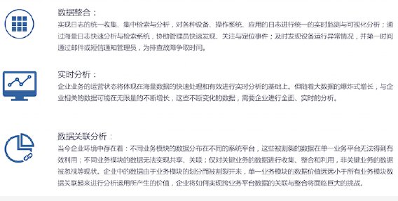 该产品采用独立于企业IT系统的部署方式,不占用原有IT资源,避免原有业务影响,使用多种接入手段将企业内部所有结构化和非结构化数据进行整合,将企业繁杂数据和信息孤岛从数据不可见进行整合,变为数据可见,并加以实时分析或离线分析,从而转化为数据可用形式,深度挖掘出数据价值。