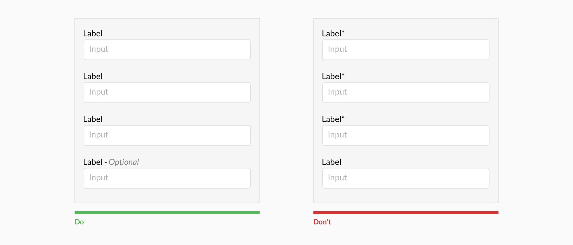 用户有的时候并不知道哪些字段是必须填写哪些可以不用填写的 ,通常会使用星号(*)来区分两者,但是星号有的时候并不能为用户理解,所以尽量用文字来标识差异。