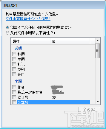 4、点击选择 从此文件中删除以下属性 ,并单击 全选 按钮,点击 确定。