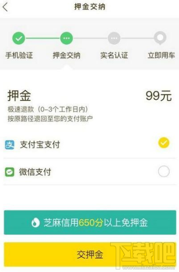 第五步,找到车之后,可以看到需要押金缴纳99元。继续往下看有这么一句话“我是学生/教职工,去认证”,点击认证