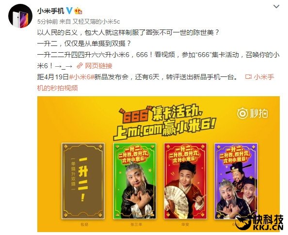 小米6系列预热视频由知名喜剧演员乔杉、修睿主演,主题是“一升二,二升四,四升六,六升小米6”,分别代表小米6的不同升级。