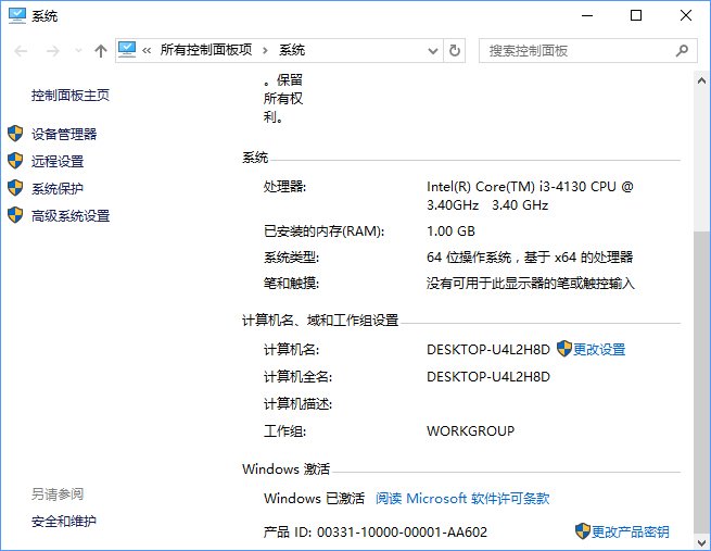 2、优化完成后,找到“此电脑”单击右键,选择“属性”,会弹出一个属性对话框,最下方会显示“未激活”如图。