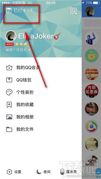 1、首先进入qq在左上角有打卡的功能;这个打卡功能在左侧的资料栏左上角,看起来很明显