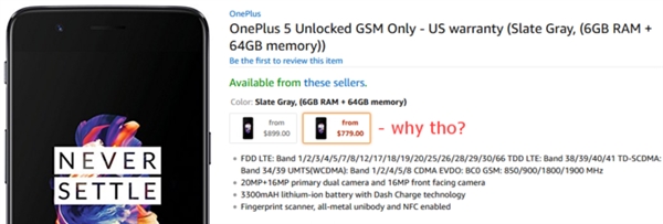 但在美亚上,一加5的现货居然被炒到了令人咋舌的新高,其中带质保的版本6+64GB是779美元,8+128GB是899美元。