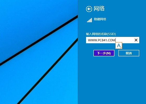2、点击其他网络后,接下来会弹出键入网络SSID名称对话框,这里就需要我们填写无线网络隐藏SSID名称(也就是Wifi无线网络名称),小编公司隐藏SSID无线网络名称为【WWW.PC841.COM】,我们输入这个名称,然后点击“确定”,如下图所示。