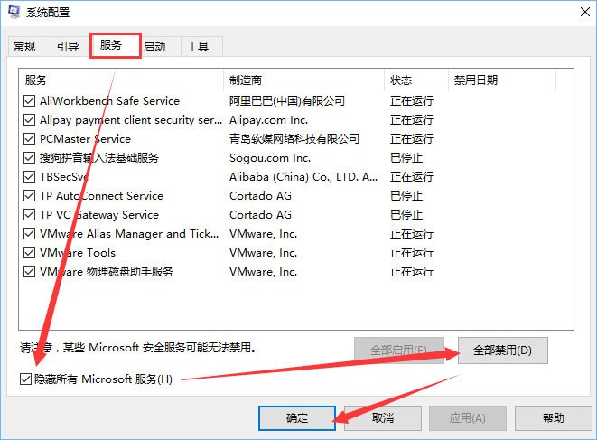 2、切换到【服务】选卡,勾选【隐藏Microsoft服务】,然后点击【全部禁用】点击确定,然后重启电脑;