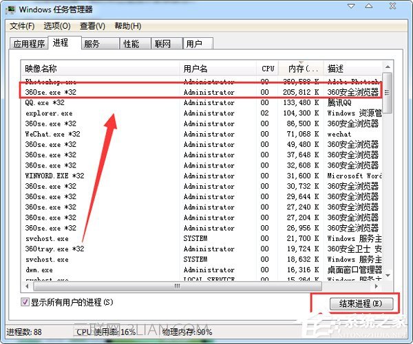 (2)这时候可以我们看到所有程序运行占用的内存,如果发现有异常程序,我们可以选中它,之后结束这个进程。