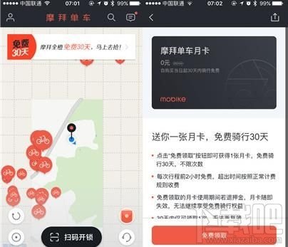 摩拜单车用户可以在单车App当中领取原价20元的月券,该卡在30天有效,在有效期内可以任意解锁摩拜单车骑行不扣除预存资金。