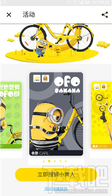 2、完成一次行程超过200米且时间大于2分钟的订单,即可随机获得小黄人卡一张,每位用户仅限每天的前3次骑行可以获得小黄人卡;