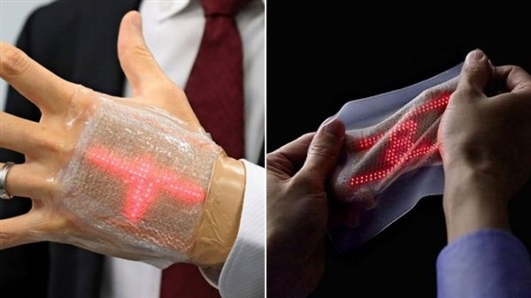 这种显示屏幕由柔韧透气的类似橡胶模材料制成,最大拉伸长度可以达到原来长度的145%,其上搭载了384个发红光的小型LED,通过纳米电极和可伸缩布线来控制显示信号。