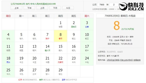 日历显示,2262年的1月21日为正月初一春节,而接下来的2月20日又是正月初一,因为那一年是“闰正月”。