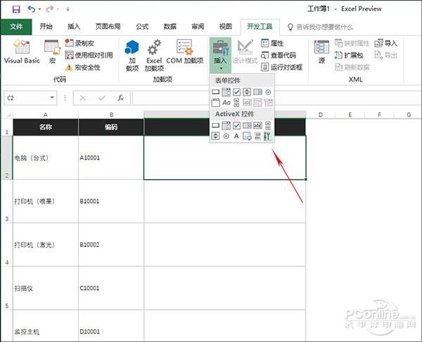 3、“开发工具”标签点击“插入”→“其他控件”,选择“Microsoft Barcode Control 16.0”;