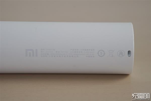 底部贴纸是参数,生产商,从标识看到,这个是江苏紫米生产,型号为LPB01ZM。名字定为:小米随身手电筒。采用3350mAh容量的锂电池,外形可以判断出是单节18650电池,移动电源方面提供5V1A输入输出,光源是3W。