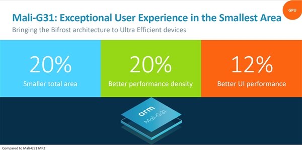Mali-G31就更入门了,相当于对Mali G51 MP2的改良版,包括成片面积缩小20%、性能提升20%、UI性能提升12%,旨在取代年迈的Mali-400系列。