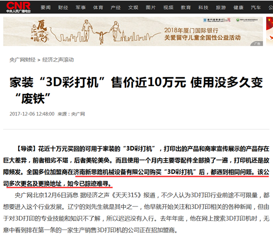 2、2017年,曾使用公司“济南新思路机械设备有限公司”,主要经营打印机。在2017年底因众多媒体曝光了这家公司的经营问题,包括《家装“3D彩打机”售价近10万元 使用没多久变“废铁”》(来源:央广网财经),无法正常经营而逃逸。该公司已于工商局网站标记为“经营异常”。