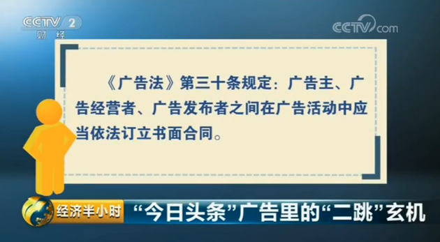 新浪科技讯 3月29日晚间消息,央视财经频道《经济半小时》今日播出《“今日头条”广告里的“二跳”玄机》,称为谋求利益,今日头条广告发布暗藏玄机,二次跳转引诱消费者步入圈套。虚假广告横行,百年老字号同仁堂名誉不保,权利被侵害,需要替虚假广告背黑锅。