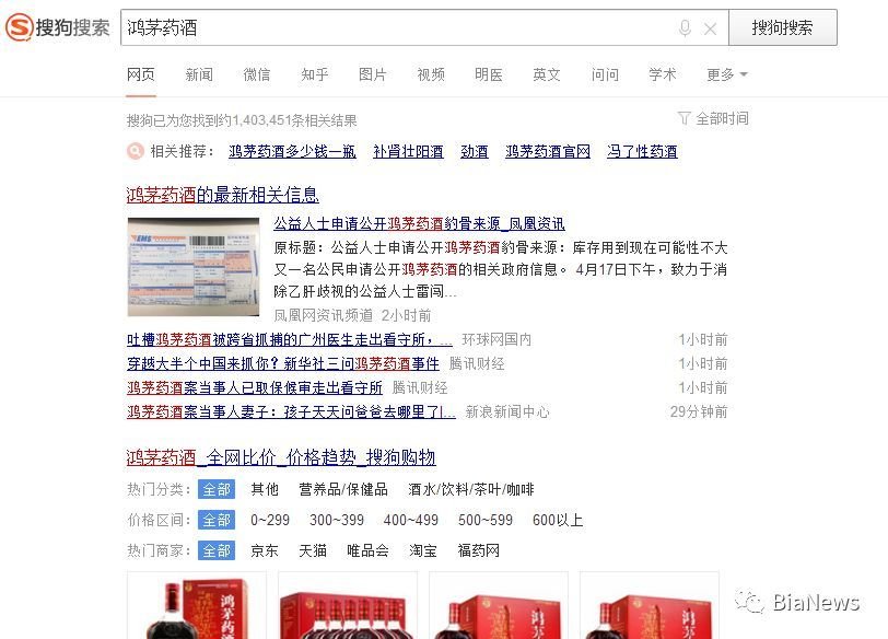 而在搜狗搜索引擎中搜索“鸿茅药酒”,出现该产品的电商平台比价及近期大量相关事件的报道,此外,并未看到相关广告。