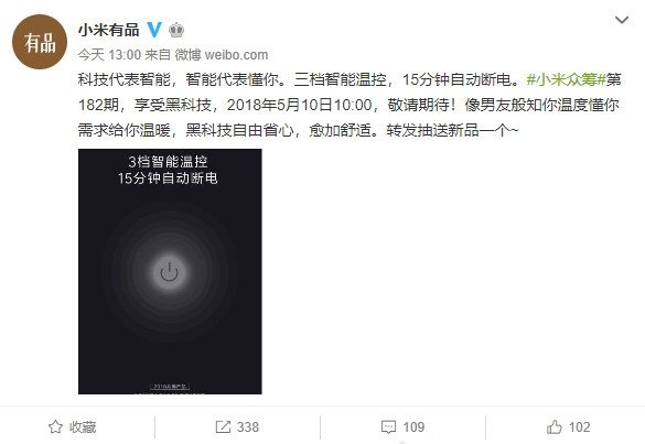 5月9日,小米有品官微发布小米众筹新品预告,预热海报显示,该产品主打“三档智能温控,15分钟自动断电”,海报中一个电源开关,官方表示,“享受黑科技,2018年5月10日10:00,敬请期待”。