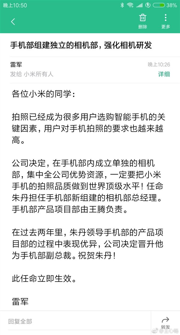 现在,一封雷军深夜小米内部群发的邮件在网上曝光,看起来中心思想非常明确,就是要要在小米成立相机部门,并通过小米的所有资源优势,把拍照给做上来。