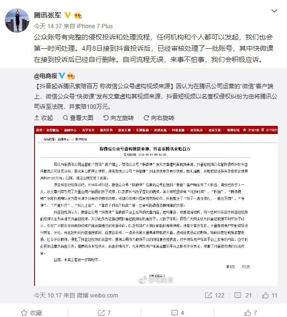 对此,腾讯公关总监张军回应称,公众账号有完整的侵权投诉和处理流程,任何机构和个人都可以发起,我们也会第一时间处理。4月8日接到抖音投诉后,已经审核处理了一批账号,其中快微课在接到投诉后已经自行删除。自问流程无误,来事不怕事,我们会积极应诉。