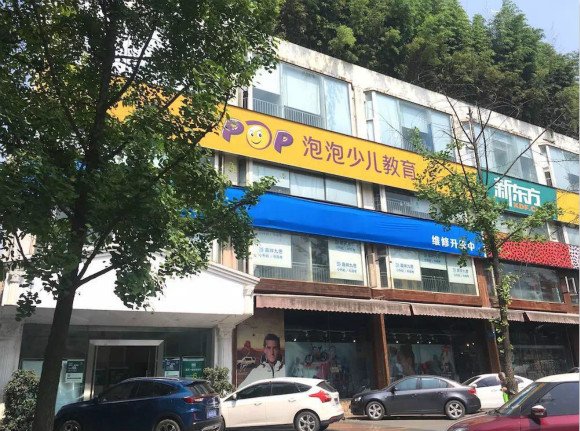 在金沙地区,新东方在一条街道边的一楼开设了门店,楼上泡泡少儿和优能中学分别将整个三层一分为二。街边一位值班师傅撑一把阳伞,在荫下午睡,伞上是新一轮的招生:“2018新初一暑假班,每科仅需99元”。