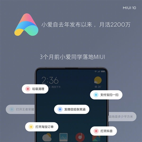AI人工智能自然必不可少,MIUI10全面应用AI更加聪明,其中小爱同学APP的月活跃用户已经超过2200万,通过和MIUI的深度整合,以及与合作伙伴提供的快应用一起共同打造语音服务生态,无需下载单独APP,一句话就能搞定手机复杂操作。