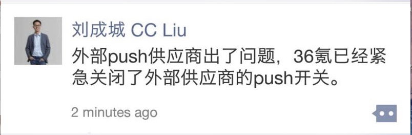 随后,36氪创始人刘成城在朋友圈回应称,是外部供应商出了问题,已紧急关闭了外部供应商的push开关。