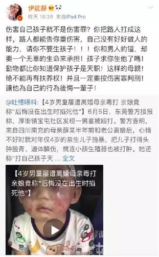 事实上,这已经不是伊能静第一次关注虐童新闻。