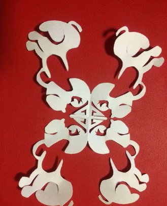 然后展开,出现2只背靠背的小狗。再次展开,4只小狗出现在眼前;这样狗年窗花剪纸就完成了。